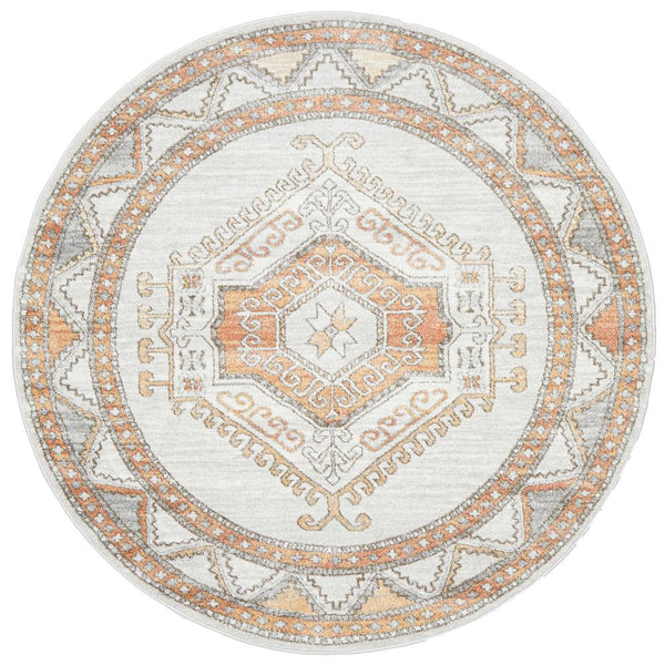 The softest hues flow through this gorgeous Aztec design. Different shades of warm peach and natural pop out of the cool white and silver background. Power loomed with a polypropylene pile, this rug is non-shed and easy care. These rugs offer style, versatility and are available in rectangles, rounds, and runners in a large variety of sizes.