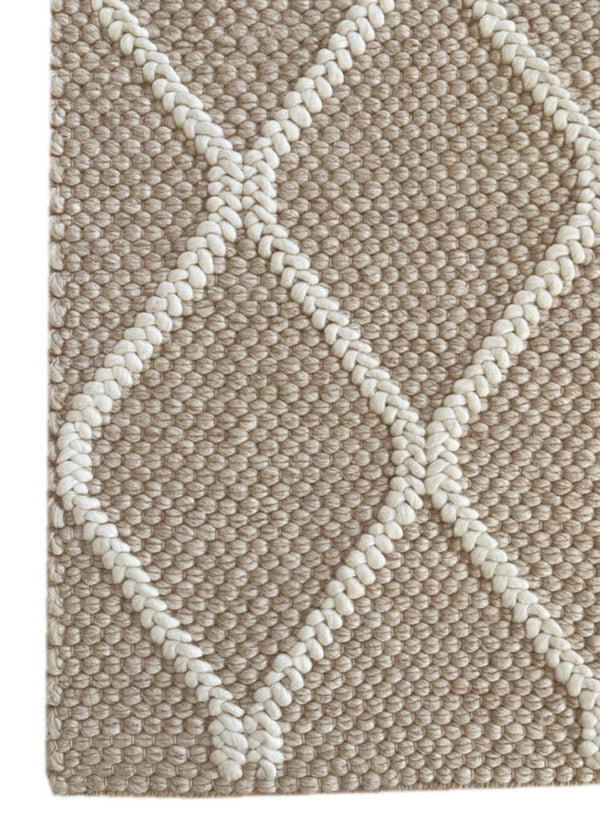 This design is all about texture. The woven surface has a chunky, tactile finish, with raised ivory patterning that stands out gently against the linen background. The geometric diamonds feel timeless—simple enough for Scandinavian spaces, yet detailed enough to add interest to minimalist rooms.