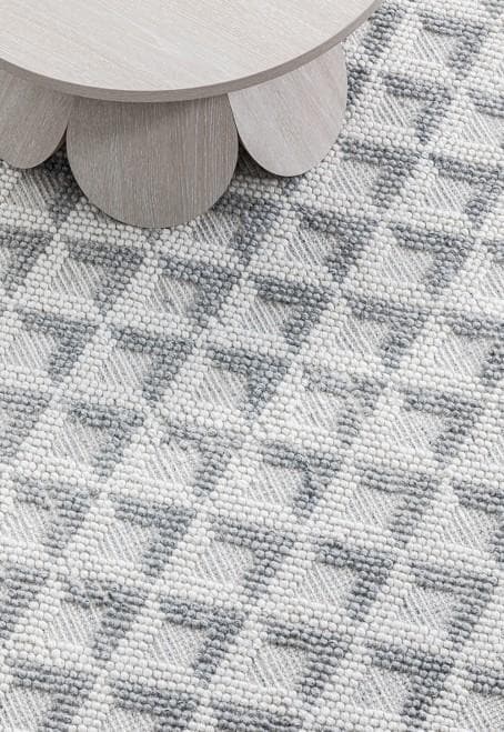 The hand-woven flatweave design shows a neat, repeating geometric pattern with raised wool texture that catches the light. The mix of natural, grey and silver tones keeps it calm and modern, so it pairs easily with timber, white, black or stone finishes.